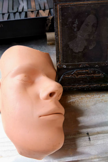 Wenn mich mein Auge nicht trügt, sind das im Hintergrund alte Holzlettern, mit denen man früher die fetten Schlagzeilen gesetzt hat, und die holde Maid auf der rechten Seite ist eine Daguerreotypie, beides unterschiedliche Medien, die heutzutage nicht mehr aktuell sind, aber in Sammlerkreisen hoch begehrt.